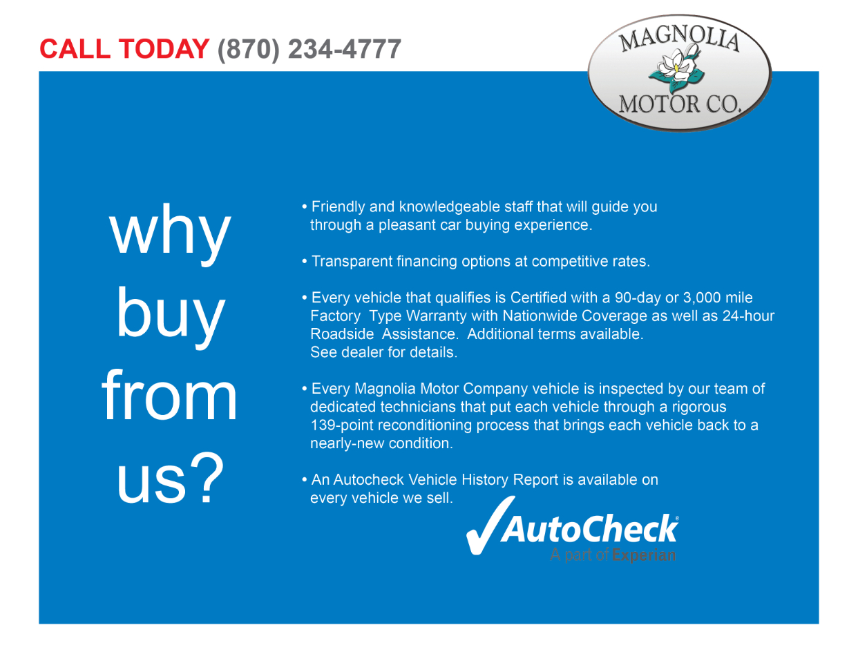 This is a quality certified pre-owned vehicle WITH WARRANTY administered by ASC Warranty. We are celebrating our 36th year in business as one of Magnolia's preferred pre-owned automobile dealerships. We are a family owned and operated business that has been serving our neighbors in the community and the surrounding areas since 1989. We strive to bring our customers the best hand selected inventory available at a fair price in a slow paced, relaxing, comfortable atmosphere that everyone enjoys.